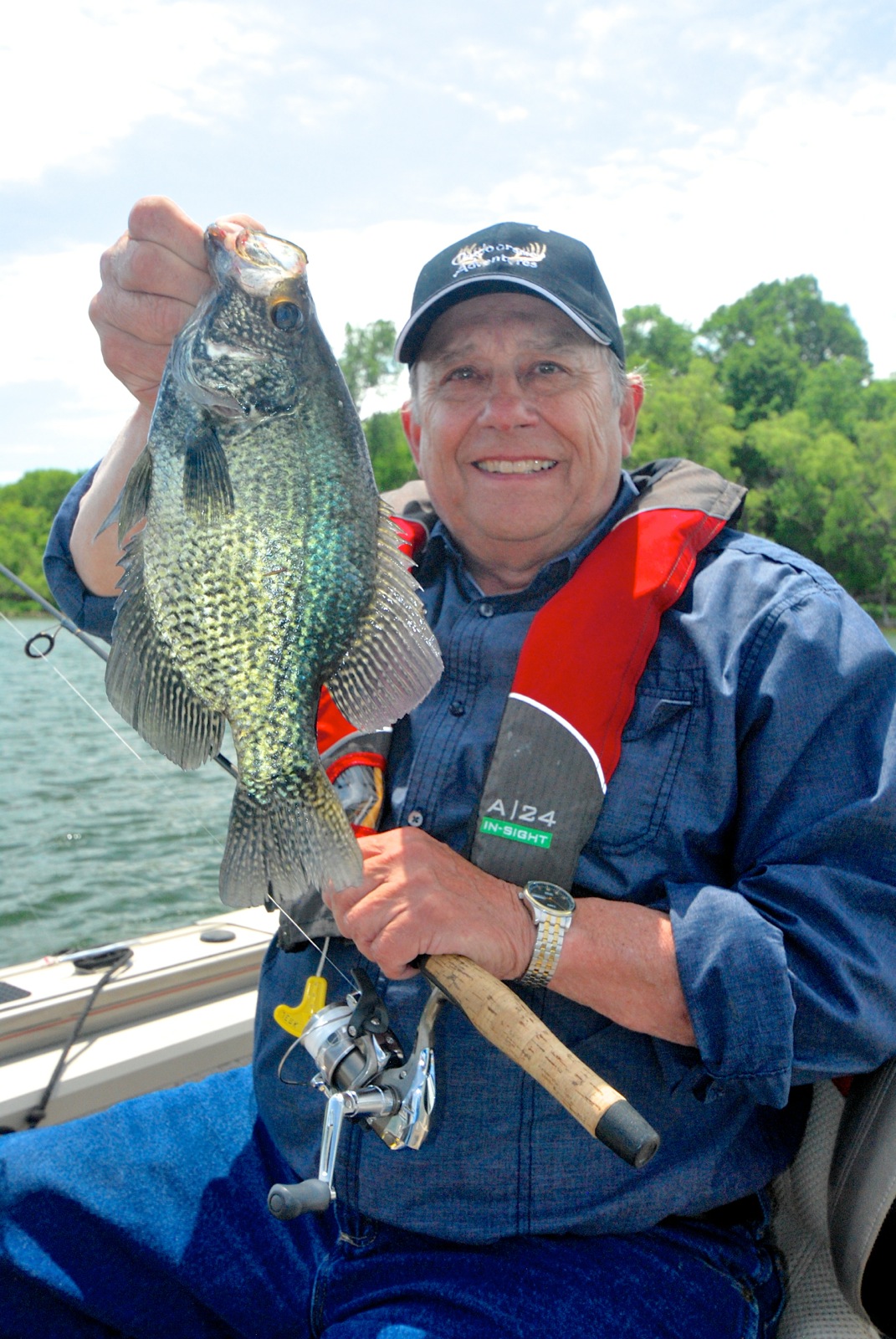 I scored right away with a nice black crappie. The fish were lying alongside the big boulders, some of which were only inches below the surface.