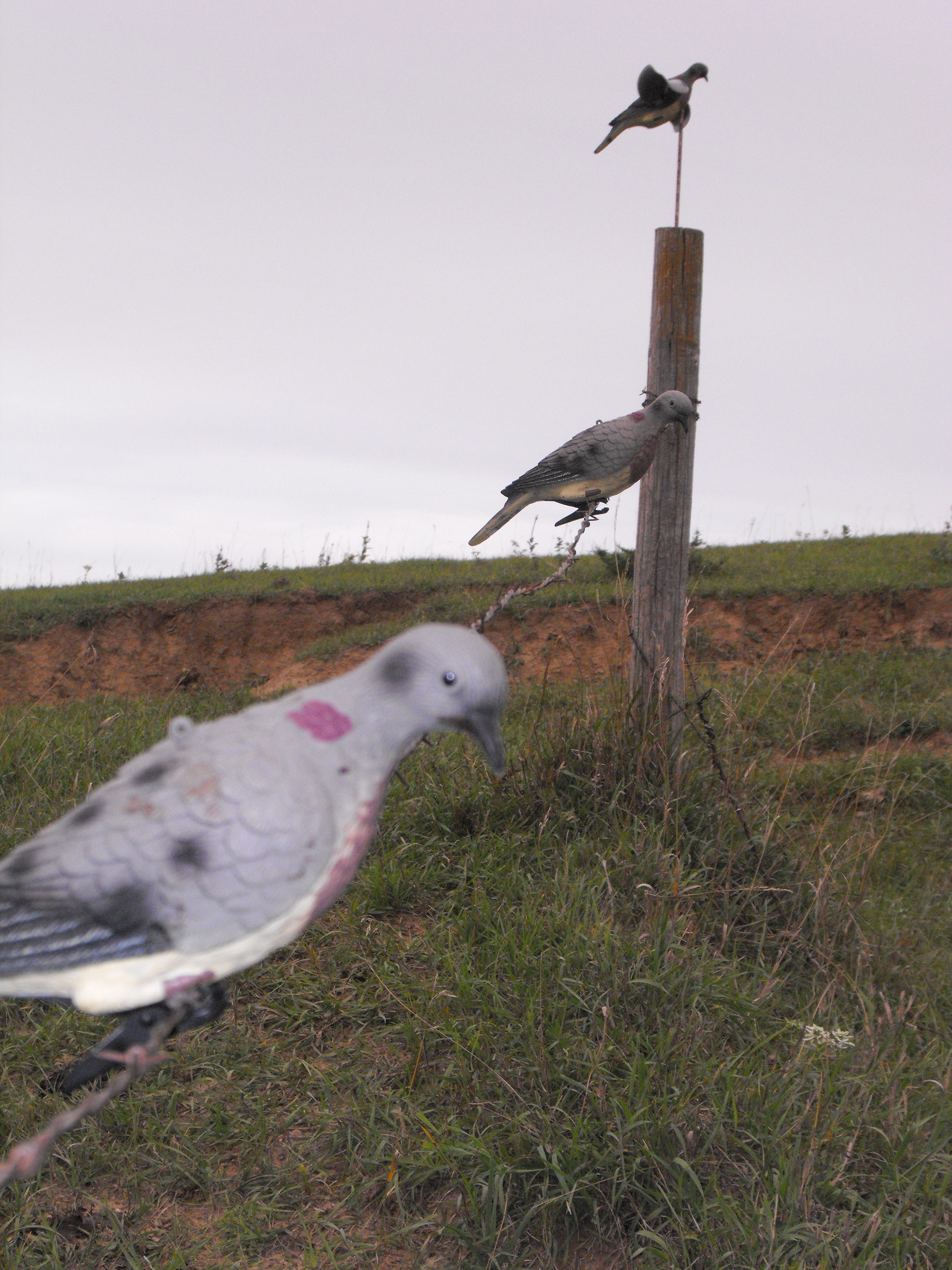 My wind driven decoy is on the uphill side of the post with one or two clip on decoys attached to the wire running down to the water. The only problem I have had with these motion decoys is when the wind is blowing hard, they have a tendency to take flight and fly off the stake.