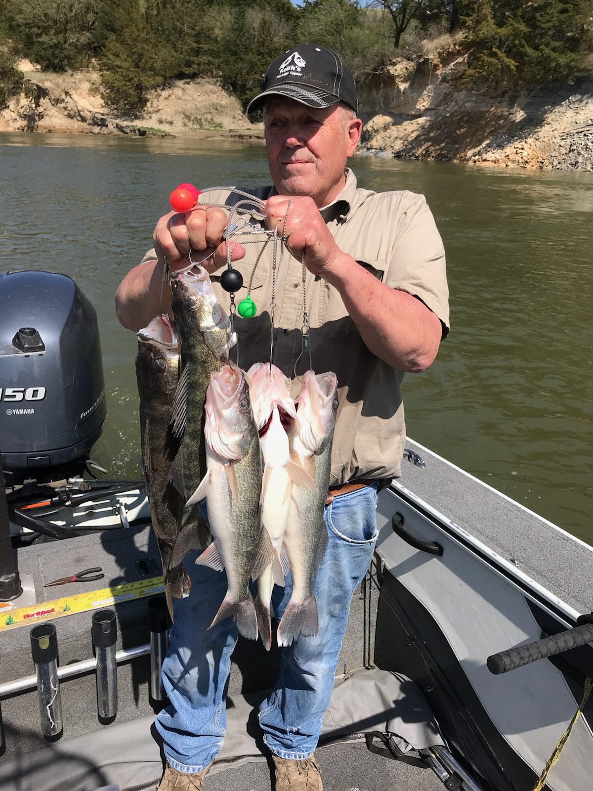 Team Member Bill Christensen, Hartington, NE. with the five male walleyes he and author caught this spring trolling crankbaits in the river above Lewis & Clark Lake. (Gary Howey Photo)
