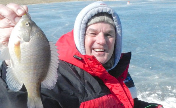 Gary Howey shows one of the bluegills we caught last week on an outing to a farm pond southwest of Hartington, Neb. Warm weather may have ended our ice fishing season now.