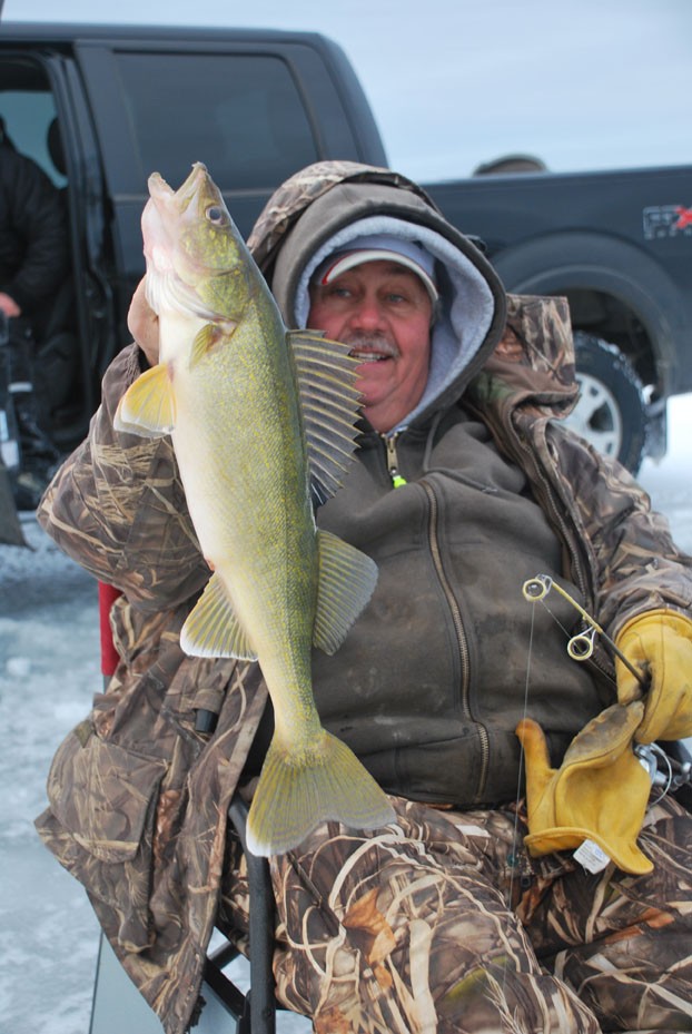 Our group spread out in a small circle and it wasn’t long before we all were catching fish. Larry brought up two small walleye he released while Junior and Don both caught a good perch. Not to be outdone, Chucked iced the big perch of the day a 1.6-pound jumbo. My first fish was a good perch and shortly thereafter, Chuck tied into another fish, one, which made the drag of his reel squeal as it, tore off line before Chuck got it under control. As the fish neared the hole, Junior helped to land it, a 3 ½ pound female walleye that we took photos of and then released back down the hole.