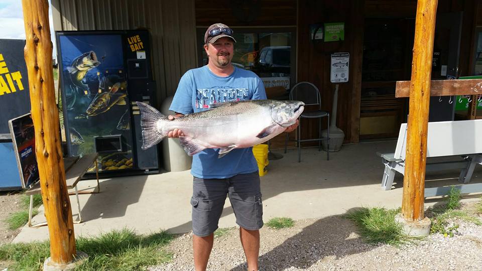 This is a photo of a 31.5 pound Salmon caught By Watertown Resident Darrick Koch in Lake Oahe and is the new S.D. State record.