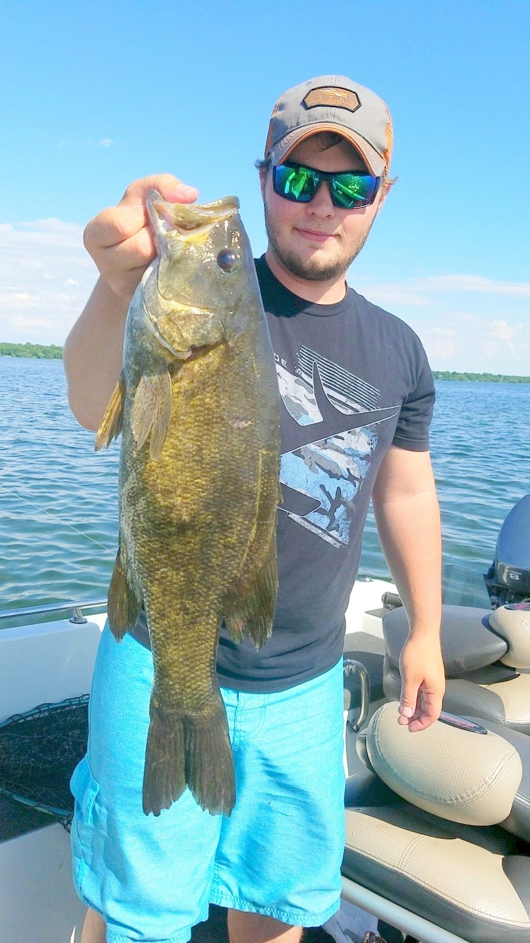 Garrett Heikes, Wayne. NE. with an excellent smallmouth bass he took while filming and fishing with Outdoorsmen Adventures television near Alexandria, MN.