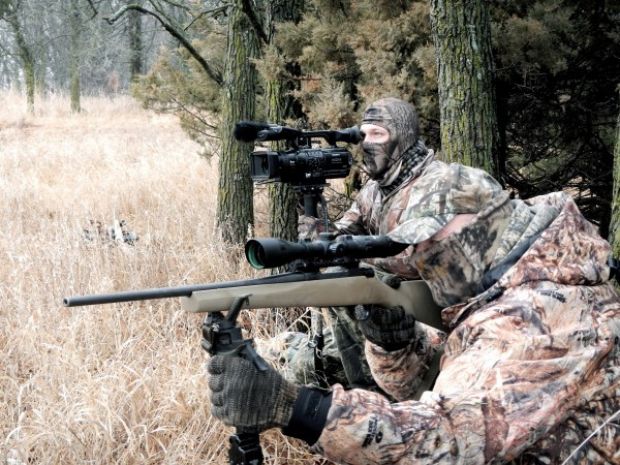 This is where some sort of camouflage, concealment enters into play. When you are calling in snow covered ground, some sort of snow camo can make or break you. My partners our cameraman and I all don complete camo, and at times, wearing snow ghille suits. Everything we bring into the field where we will set up and call, including our rifles, shotguns, clothing, stocking caps, and facemasks match the terrain.
