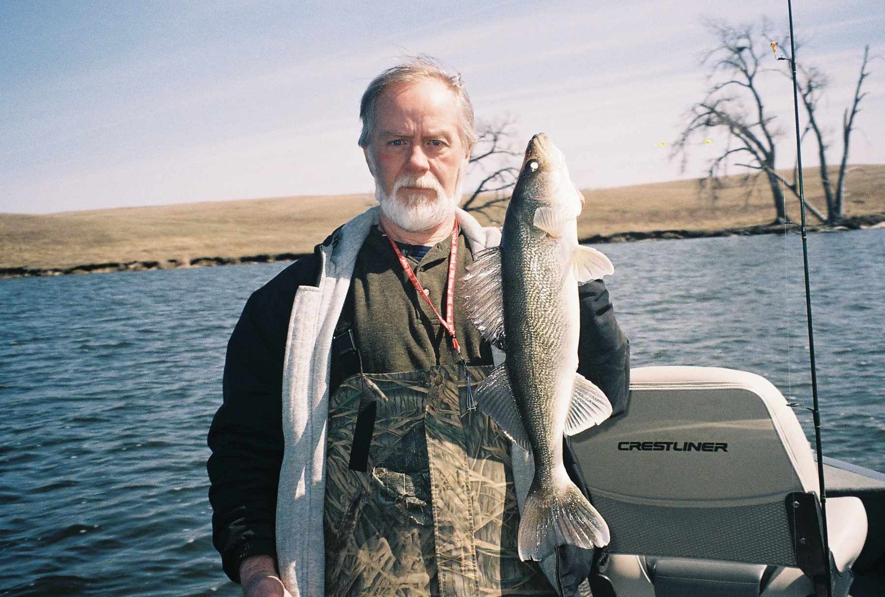 Team Outdoorsmen Adventures member Don Fjerstad, Watertown, S.D. with a walleye taken from a mud to gravel change in the bottom structure in a Glacial Lake in Northeastern South Dakota.