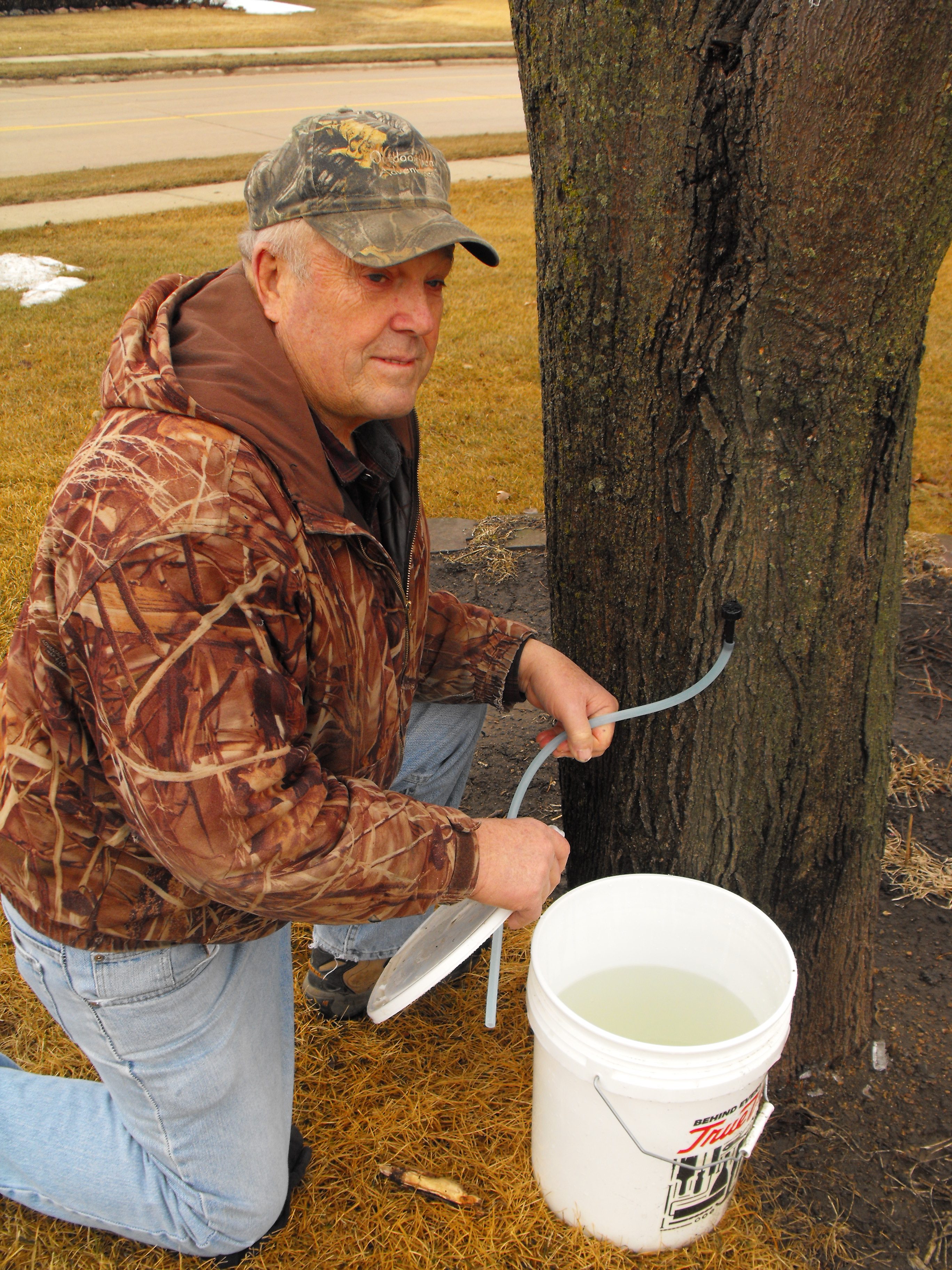 Bill Christensen, Hartington, NE. a local tapper inspects one of the sixteen Maple trees he tapped in order to make this year’s batch of Maple Syrup. (Gary Howey Photo)