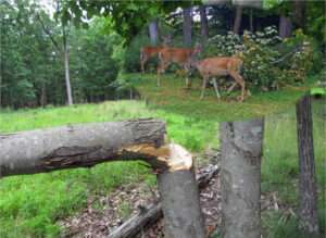 The first big, old doe with the “Roman nose” starts checking the apple tree just outside our living room window as early as June. That old girl wants to be first and she knows this particular tree, which was here when we bought the property 25 years ago, is the earliest to bear fruit. With the prolonged droughts we’ve experienced it’s no wonder she tries to be at the front of the line for this sweet, high-moisture content food.
