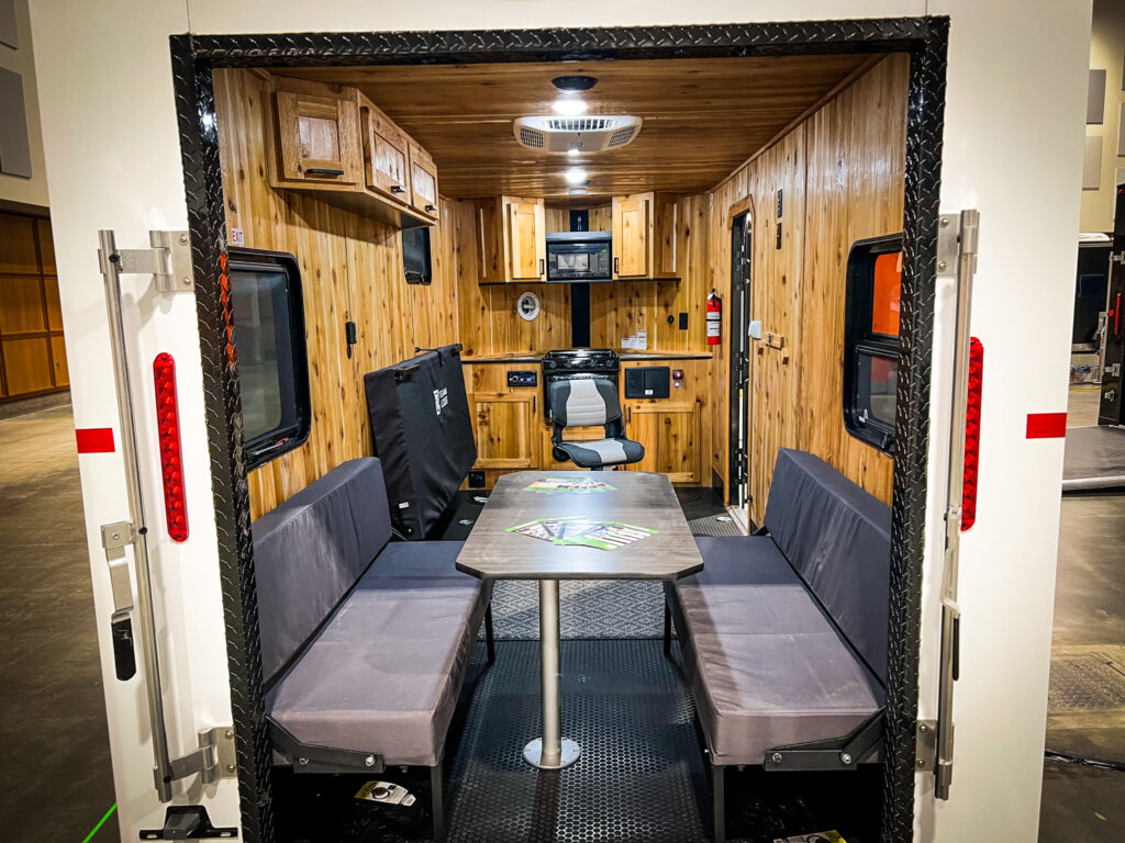 THE INTERIOR, WHICH CAN BE CUSTOMIZED, HAS EVERYTHING HE AND HIS MISSES WOULD NEED, INCLUDING: SLEEPING FOR THREE TO SIX PEOPLE, FOLD-DOWN BUNKS THAT CAN CONVERT TO COUCHES AND BEDS, WITH COOK-TOP, MICROWAVE, KITCHEN SINK, CABINETS, BATHROOM W/ SHOWER, AIR CONDITIONER, FURNACE, TV HOOKUPS AND OTHER AMENITIES.