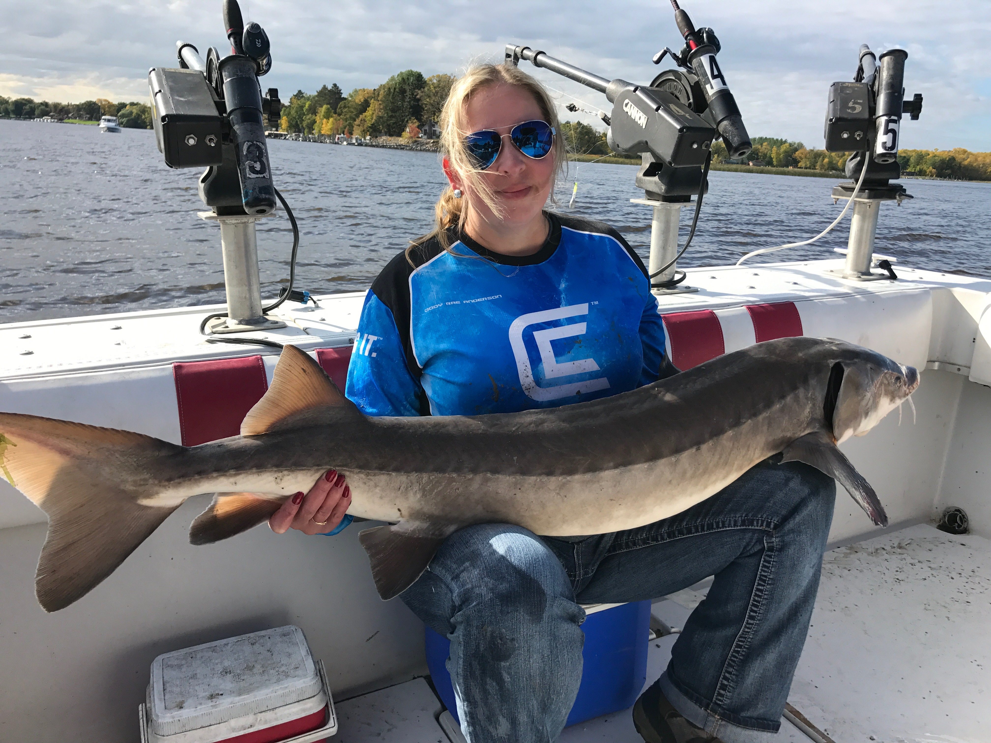 Jody Rae Anderson holds the 57-inch Lake Sturgeon she landed on her second day of fishing on the Rainy River in Northern Minnesota.