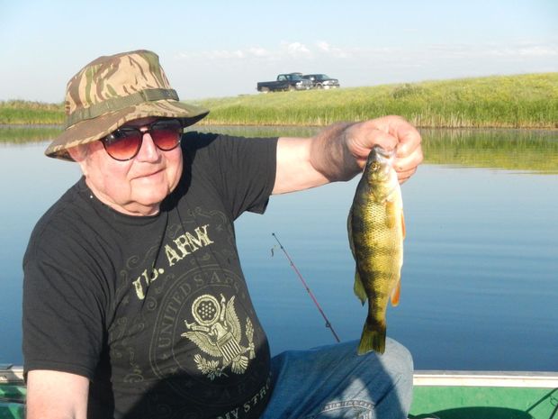 So what are the downsides of fishing West River stock dams? Well, the weather is one. Summertime is beastly hot, usually. Severe weather is always a possibility. The tall grass is perfect habitat for ticks, chiggers and mosquitoes. This is also rattlesnake habitat and encountering one is a real possibility.Nelson-Perchjpg
